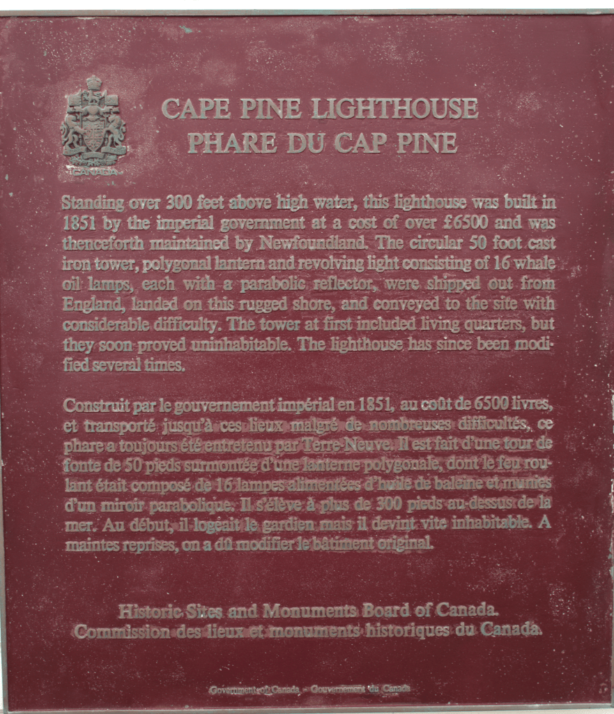“Standing over 300 feet above high water, this lighthouse was built in 1851 by the imperial government at a cost of over £6500 and was thenceforth maintained by Newfoundland. The circular 50 foot cast iron tower, polygonal lantern and revolving light consisting of 16 whale oil lamps, each with a parabolic reflector, were shipped out from England, landed on this rugged shore, and conveyed to the site with considerable difficulty. The tower at first included living quarters, but they soon proved uninhabitable. The lighthouse has since been modified several times.”