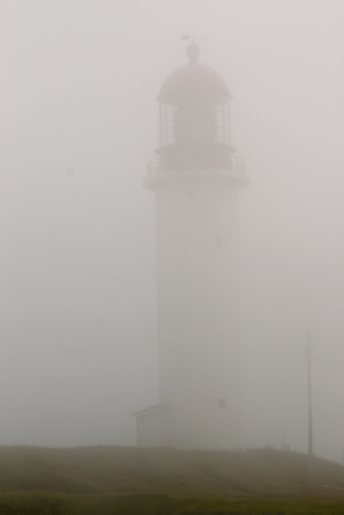 I wasn’t expecting there to be any fog, truly. It was a beautiful drive through Ferryland and Renews with clear skies and then suddenly, when I made the turn for the Cape Race lighthouse, everything became shrouded in the thickest fog I’ve seen in a long time. Maybe this sort of fog is normal here on the Southern shore, but gosh it blew my mind. I didn’t even notice the MASSIVE lighthouse until I was driving right below it.
